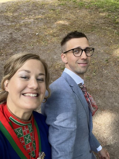 Klädkod på vigseln är- Kläder efter väder. Vigsel kommer att vara utomhus med chans att värma sig om det krävs innan och efter själva akten. Vill man ha med sig varma kläder för att när vigselakten börjar ta av sig till en folkdräkt, gapta eller annat snyggt så blir ingen gladare än vi. Vill du färgmatcha så är det färger som återfinns i den sydsamiska kolten (gapta). Det är coboltblå, röd och grön.  Brudskålen är utomhus.